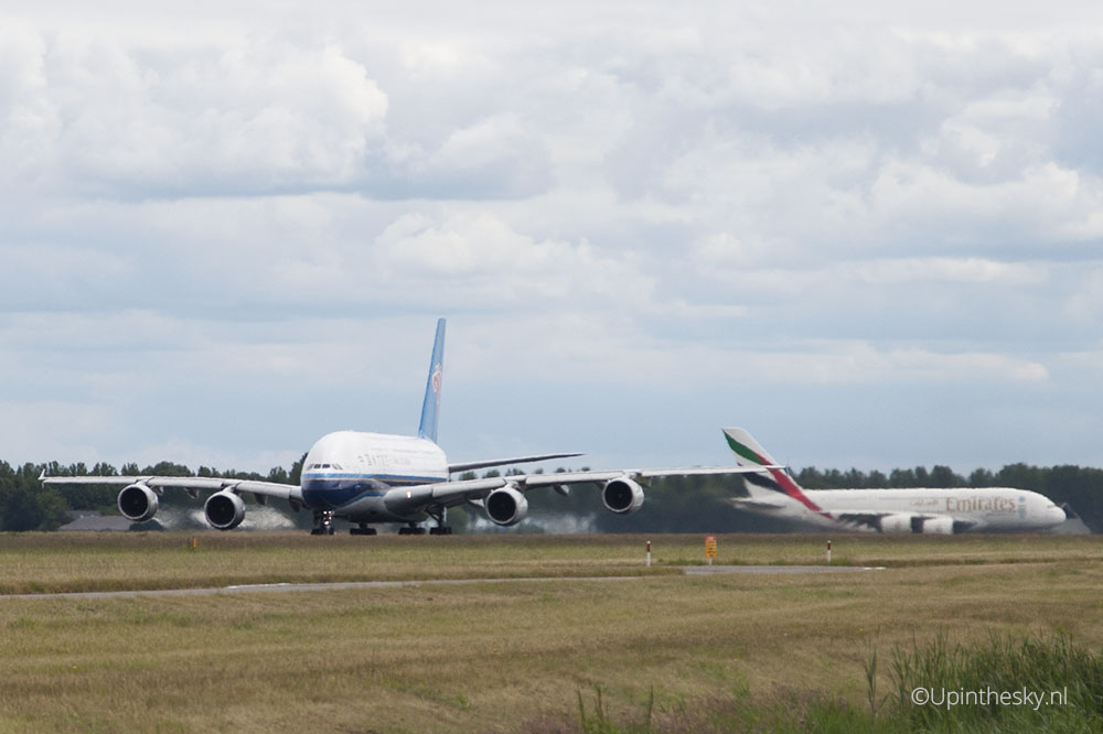 Gister was de eerste vlucht van de China Southern A380 op Schiphol (afkomstig uit Peking). Aan boord kunnen 506 passagiers. Het toestel (B-6137) kwam los van de grond om 15:38 uur. Direct daarna stond nog een A380 klaar om te vertrekken: A6-EEJ van Emirates. Hier kunnen 517 passagiers in. Om 15:40 uur kwam dit toestel los van de Polderbaan.