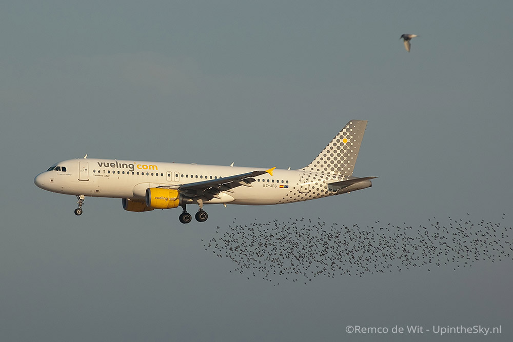 De foto van vanochtend is gemaakt door Remco de Wit, in de buurt van Venetië. Hij vertelt over de foto: “op vakantie in Venetië heb ik in de vroege avond een paar uurtjes doorgebracht bij Marco Polo Airport. Daar verscheen onder andere deze Vueling Airbus A320 voor mijn lens. Pas thuis ontdekte ik dat op de foto ook een zwerm vogels te zien is.”