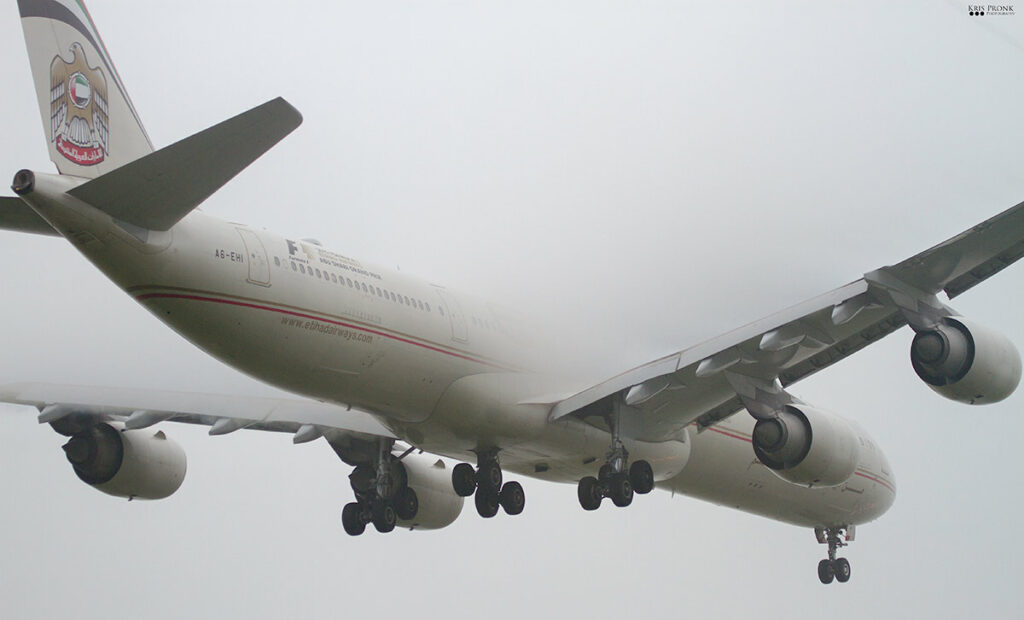 Gisteren landde er voor het eerst een Airbus A340-600 van Etihad op Schiphol. Het was de tweede keer dat er een toestel van dit type op de luchthaven was, een aantal jaar geleden was er ook al een van Virgin Atlantic uit Engeland. Etihad zette de verlengde Airbus in op vlucht EY77 uit Abu Dhabi omdat ze meer vracht te vervoeren hadden dan normaal. Etihad zal de komende zondagen vaker het type toestel in gaan zetten op de vluchten uit Abu Dhabi. Door de hevige mist die gister rond de luchthaven hing, moest het toestel eerst een half uur in de holding boven Flevoland. Fotograaf Kris Pronk, die aanwezig was bij de landing vertelt: “We wisten dat het toestel er aan kwam door Flight Radar, maar je kon echt niks zien. Toen het toestel eenmaal door de mist heen kwam konden we het maar voor een seconde of tien zien, dus we moesten heel snel foto’s maken.” Hieronder de foto’s van de landing.