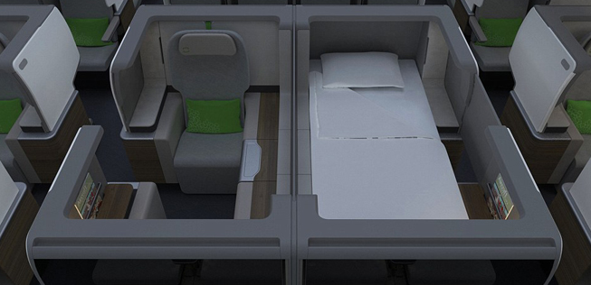 Stapelbedden in de businessclass sectie van een vliegtuig. Het klinkt onwaarschijnlijk, maar als het aan het Amerikaanse Formation Design ligt, wordt dit in de toekomst mogelijk. Het bedrijf, gevestigd in Atlanta, ontwierp een design waarin niet alleen rekening werd gehouden met de breedte van de cabine, maar ook met de hoogte.