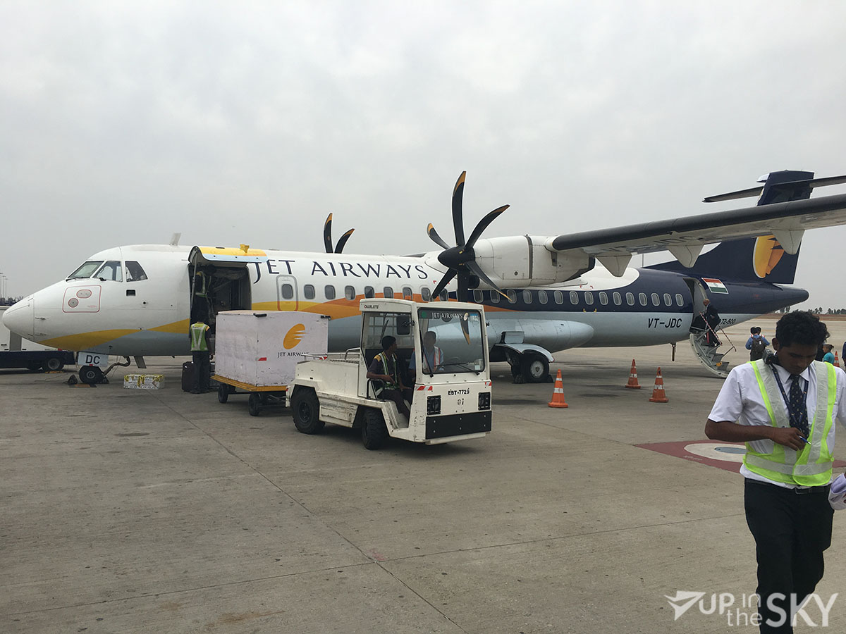 Met een bus werden we naar het platform gebracht. Het toestel waarmee we in een krap uurtje naar Chennai (voorheen Madras) vlogen was een ATR 72-500, een tweemotorig turboprop toestel met 16 rijen. Gezien de zware pre-Moessonregens met in de verte geregeld bliksem in zowel Bengaluru als Chennai, boezemde dit lichtgewicht toestel sommige passagiers nou niet direct vertrouwen in. Niettemin staat het toesteltype bekend als betrouwbaar.