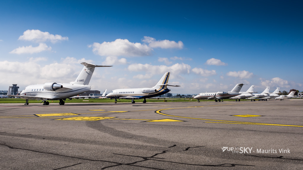 Zeven business jets naast elkaar op het platform.
