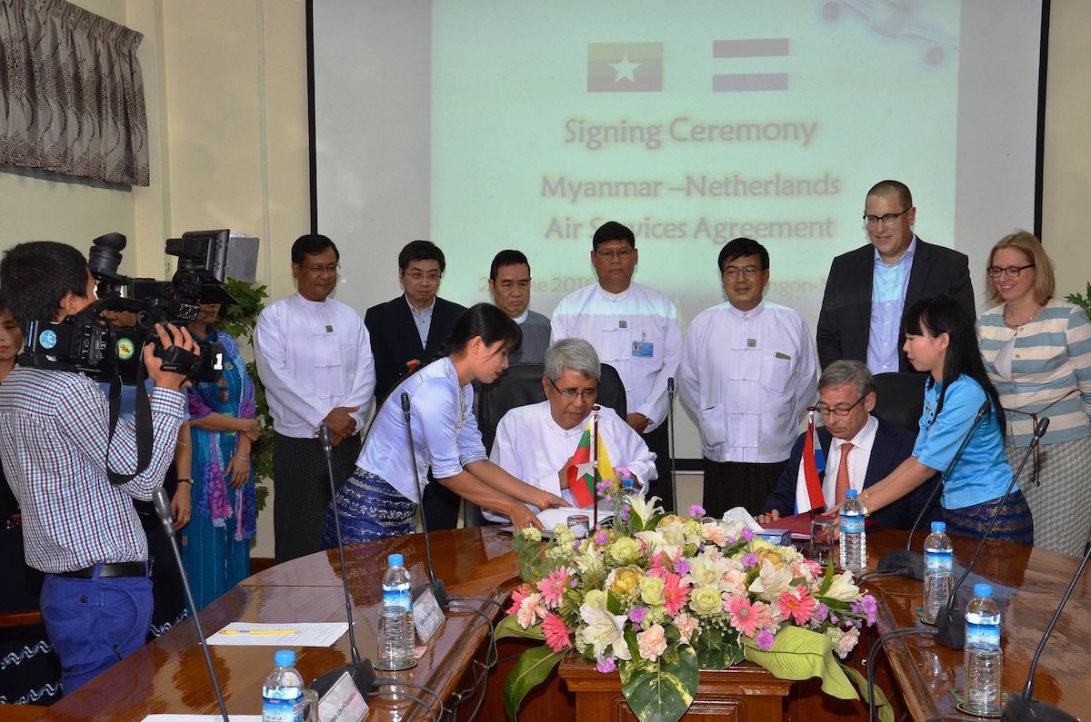 De overeenkomst werd getekend door de Nederlandse ambassadeur en de Myanmarese onderminister van Transport. “Het gaat om een vernieuwd akkoord, dat recht doet aan alle hedendaagse luchtvaartpolitieke ingrediënten”, aldus De Jong. “Op deze manier formaliseren beide landen de luchtvaartrelaties die nodig zijn.” Met de ondertekening kunnen niet alleen luchtvaartmaatschappijen uit beide landen directe luchtverbindingen onderhouden, maar wordt het ook gemakkelijker om met partners uit SkyTeam zogenaamde third party codeshares uit te voeren. Mocht de hoeveelheid vervoer op dit moment een directe dienst nog niet rechtvaardigen, dan biedt een codeshare een mooie manier om het netwerk van Schiphol en daarmee de verbinding met Nederland verder uit te breiden.