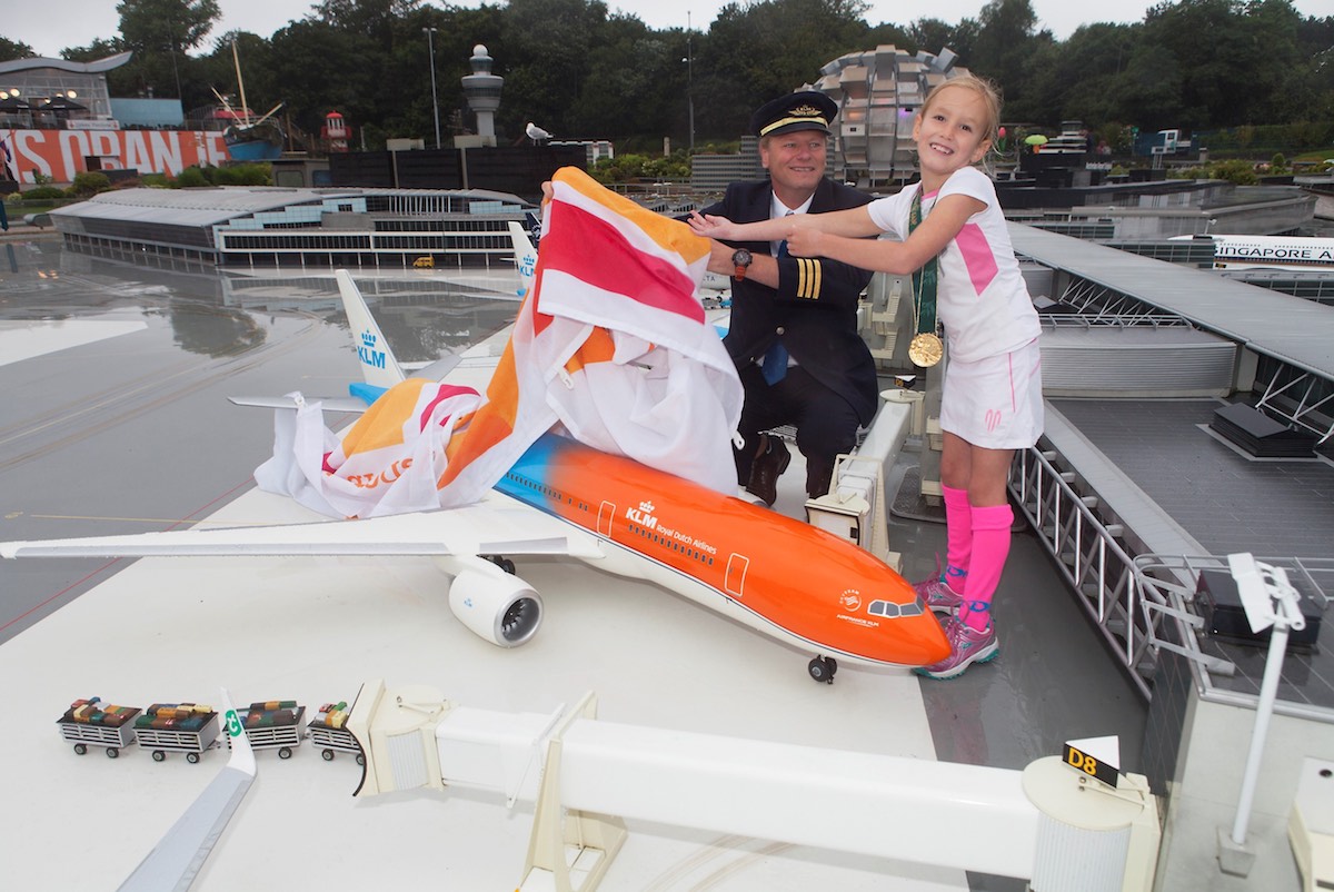 In juni dit jaar introduceerde KLM namelijk haar eerste en enige deels oranje gespoten Boeing 777-300 in haar vloot. Op de luchthaven van Madurodam kan een kleine versie daarvan natuurlijk niet ontbreken. De oranje miniatuur is vandaag onthuld door aanstormend hockeytalent Sophie Nieboer en Maurits Crucq, oud Olympisch medaillewinnaar en KLM-piloot. De oranje Boeing 777 in de KLM-vloot staat namelijk voor het oranjegevoel van Nederland, #OranjeBoven. KLM zet het toestel in op haar reguliere vluchten in het netwerk en waar mogelijk voor evenementen waar de promotie van Nederland een rol speelt, zoals tijdens de Olympische Spelen in Rio de Janeiro.