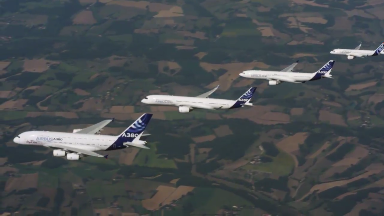 Airbus heeft zojuist een video vrijgegeven waarin te zien is hoe toestellen uit alle model-families van het bedrijf een formatievlucht uitvoeren. Op deze spectaculaire beelden komen zowel de A320, de A330, de A350 als de A380 voorbij: