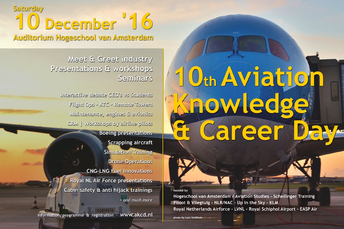 De tiende editie van de Aviation Knowledge and Career Day vindt ook dit jaar plaats op de Hogeschool van Amsterdam. Het Leeuwenburg gebouw naast het Amstelstation is op 10 december het decor van een dag met een druk en afwisselend programma.