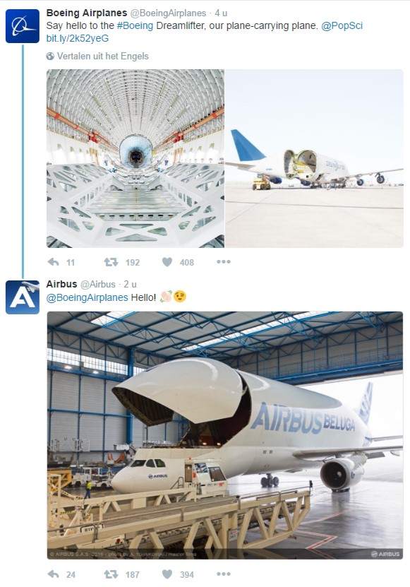 Boeing deelde gisteren op Twitter een artikel, met het onderschrift “Zeg hallo tegen de Dreamlifter, ons vliegtuig dat vliegtuigen vervoert.” Grote rivaal Airbus kon het niet laten om op die tweet te reageren, en stuurde daarbij een foto van haar eigen ‘vliegtuig dat vliegtuigen vervoert’:
