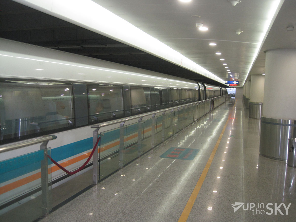 Het is even zoeken naar het platform; je moet een verdieping hoger zijn. Daarvoor moet je eerst naar buiten en dan -via de security- weer naar binnen om naar boven te kunnen. De trein zoeft met ruim 300 (!) kilometer per uur naar Longyang Road station. Hij schijnt de 400 kilometer te kunnen halen. Vanaf Longyang kun je met 3 metrolijnen verder, die weer aansluiten op alle andere, zodat heel Shanghai met de metro te bereiken is.