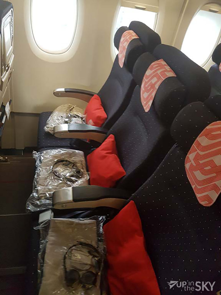 Op de stoel lagen een dekentje, een kussentje en de headset (met daarbij een slaapmaskertje en een doekje) voor het entertainmentsysteem. Die headset was het enige dat paste op het systeem. Je kon geen eigen headset aansluiten. Iets wat ouderwets aanvoelt.