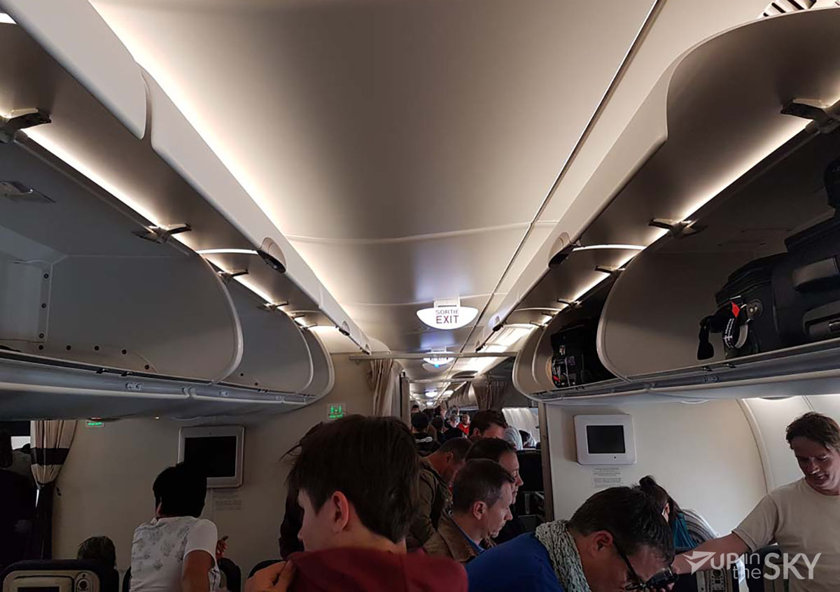 Ondanks de grote van het toestel, gaat het boarden vrij snel. Op het vliegveld zijn drie rijen gemaakt, Businessclass, upperdeck en lowerdeck. Mijn stoel was in het lowerdeck.