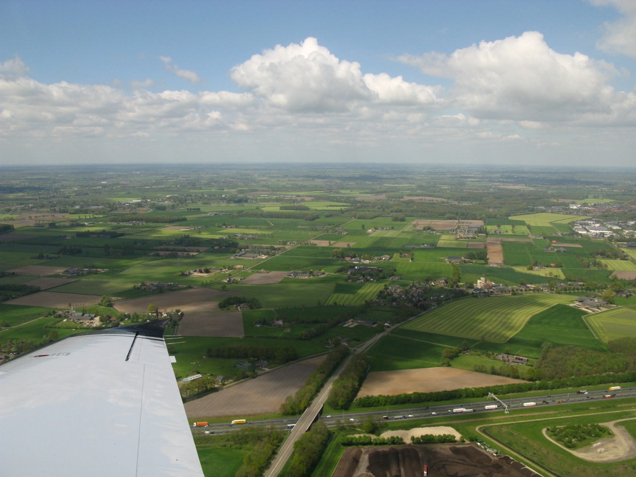 Enfin, we taxiën over het verlaten veld naar de baan, en na een aantal checks lijnen we op voor de start. De take off is bepaald spectaculair te noemen. Een klein beetje back pressure is genoeg om het toestel de lucht in te doen springen. Om met een relatief klein, voor een zuigermotor ontwikkeld toestel kruissnelheden van rond de 500 kilometer per uur te halen, dien je ietwat overpowered te zijn, en dat is natuurlijk merkbaar in de take-off. Nog geen mijl van het veld zitten we al onder een hoek van twintig graden achterover in onze stoelen, en staat er 1500 fpm op de VSI. De gemiddelde piloot zal zijn pax dit niet aandoen, maar in deze situatie is het natuurlijk prachtig.