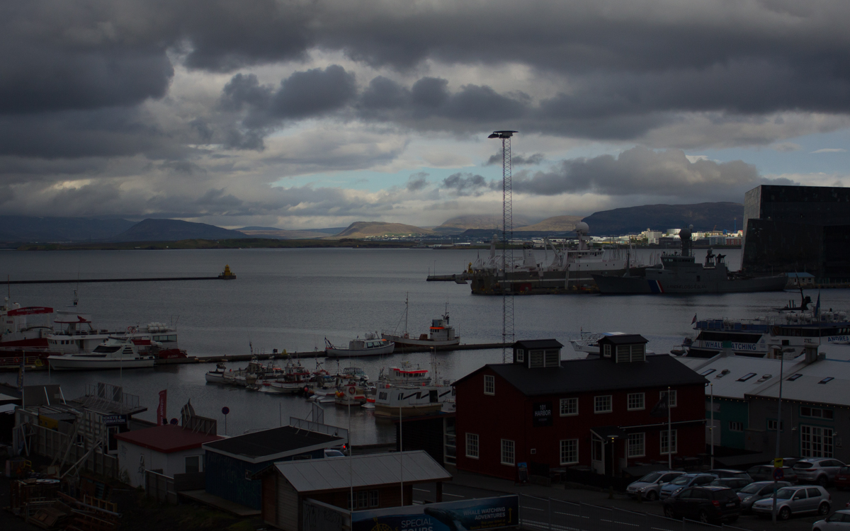 De kamer op de derde verdieping is niet groot, maar prima. Goede bedden, functionele badkamer met fijne douche. De kamer heeft een klein balkon, daarvandaan kijken we uit over de haven en is er uitzicht op de berg Esja.