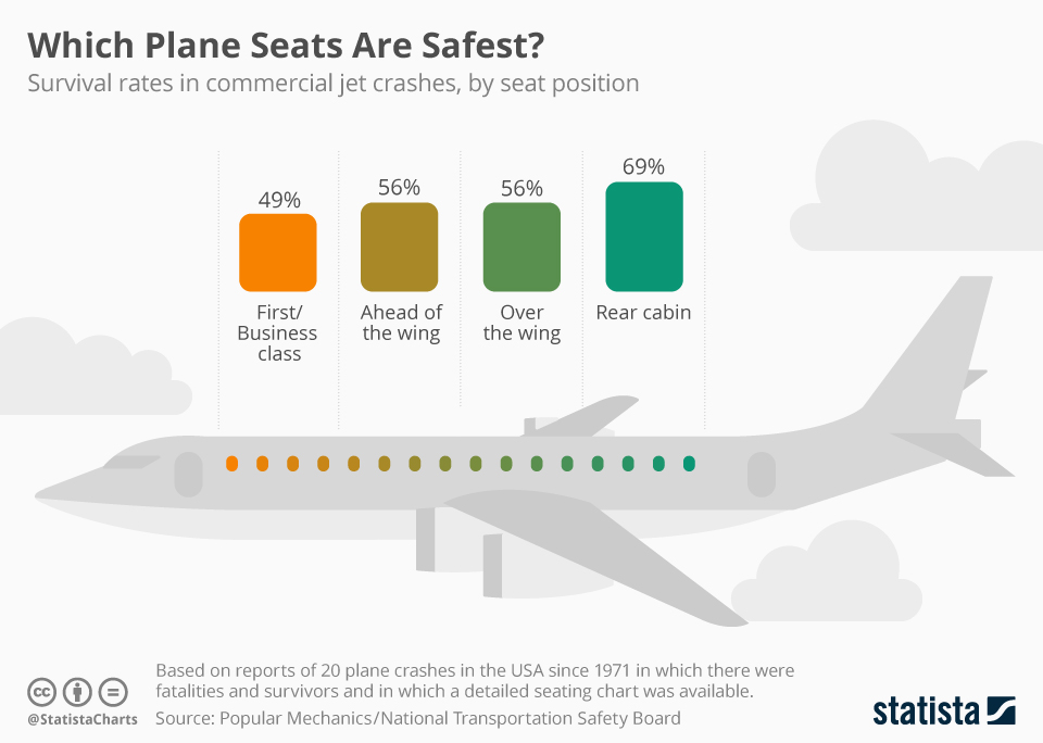Opmerkelijk genoeg hebben de reizigers die het meeste voor hun ticket betalen en vooraan in business of first class zitten dus de minste kans op overleving. Wie het veiligst wil vliegen, moet voor een goedkope economy-stoel gaan.