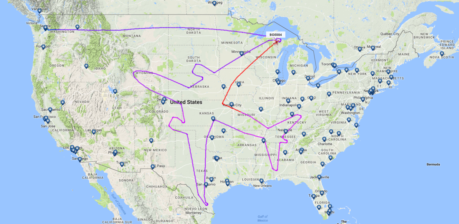 Al sinds gisteravond is vlucht BOE004 onderweg. De Boeing 787-8 Dreamliner met registratie N7874 maakt een testvlucht boven de Verenigde Staten, maar geen gewone. Op de vliegradar is te zien hoe het vliegtuig het silhouet van een grote Dreamliner ‘tekent’.