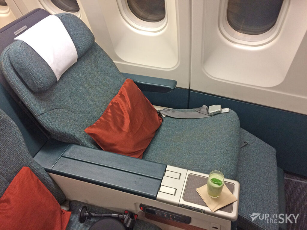Hoewel het boarden zo’n 10 minuten later begon dan gepland, ging het boarden georganiseerd. Eerst platinumleden, daarna business- en elite-leden en vervolgend economy-passagiers. De regionale Airbus 330-300-toestellen van Cathay hebben een business, premium economy en economyklasse De business bestaat ui 4 rijen met riante zetels in een 2-2-2-opstelling. Op elke zitting lag een eenvoudige koptelefoon en een kussentje klaar. Tussen de stoelen zit een cocktailtafeltje met stopcontact en elke stoel heeft bovendien een kuitensteun. De rugleuning kan redelijk ver achterover, in ieder geval ver genoeg voor de relatief korte vluchten waarop dit toestel wordt ingezet. De stoel lijkt daarmee erg veel op de premium-economy aan boord van het toestel dat tussen Amsterdam en Hongkong vliegt.