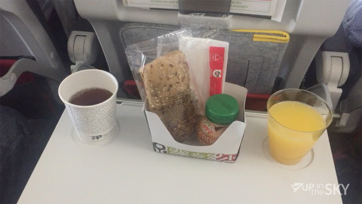 Zodra het vliegtuig in het cruise-gedeelte van de vlucht is, begint de catering. Er wordt een broodje geserveerd met een fris smeersel erop. Bij het broodje komt een fruit-smoothie. Daarnaast kan zowel een warme als een koude drank genomen worden. Er is wijn en daar wordt redelijk riant van geschonken. Het eten en drinken smaakt oke.