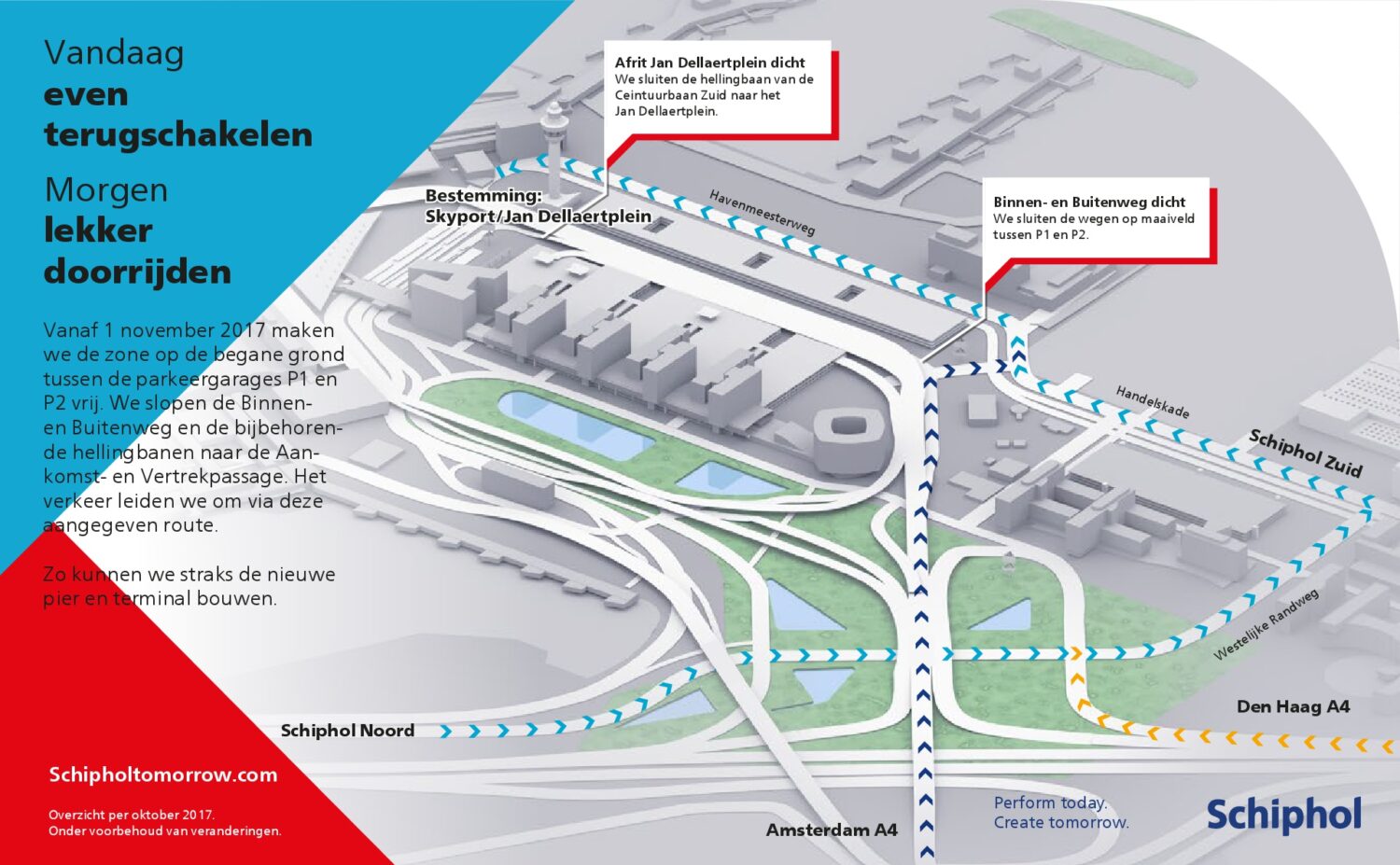 Vanaf 1 november zijn de Binnenweg, Buitenweg en de bijbehorende hellingbanen afgesloten. Dit heeft vooral gevolgen voor lokaal en expeditie verkeer, meldt Schiphol. Verkeer richting Skyport en het Jan Dellaertplein rijdt voortaan via de Havenmeesterweg. Verkeer dat van lokale wegen komt en naar de Vertrekpassage wil, kan via de Retourbaan rijden. De nieuwe routes zijn met borden aangegeven.