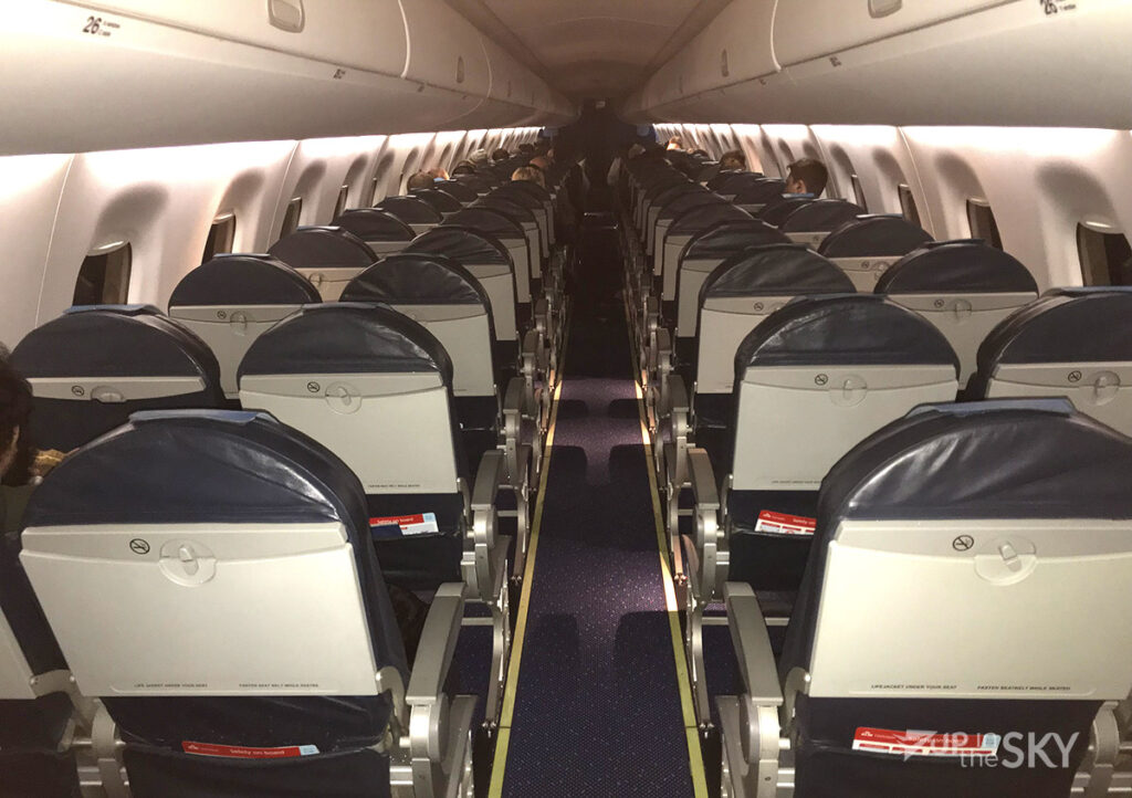 De Embraer 190 met de mooie stoelen met een soort lederen bekleding, zit voor nog geen kwart vol. Het boarden gaat daarom vlot. Wat opvalt is dat de langere passagiers wel bijna met hun kruin tegen het plafond aanzitten. Het verschil tussen een E175 en E190 is behalve het aantal stoelen, dat de 190 ook een nooduitgang in het midden heeft. De stoelen staan in een 2-2 opstelling. Het is gewoon een mooi en knus toestel.