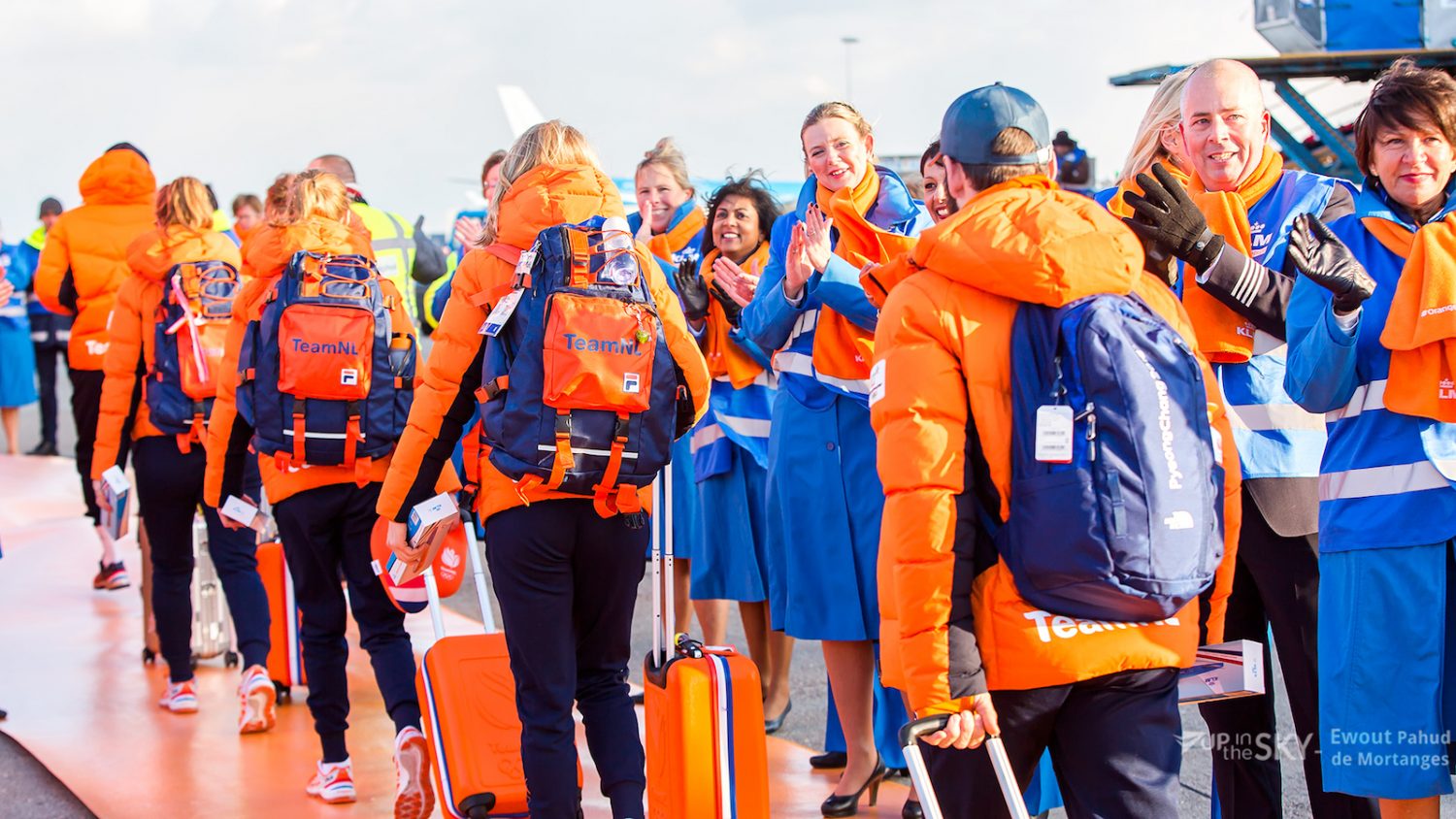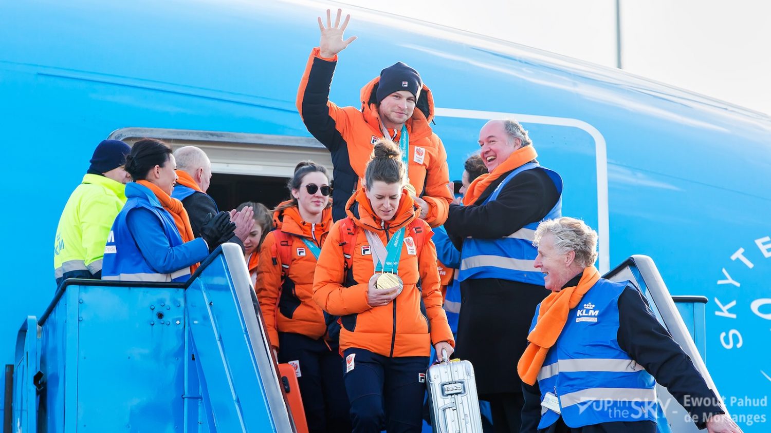 De Boeing 777-306ER van KLM landde iets voor 16:30 uur op Schiphol. De vlucht werd op het laatste stuk begeleid door twee F-16’s van de Koninklijke Luchtmacht. De twee straaljagers waren vanuit de Vliegbasis Leeuwarden opgestegen. Na een rondje boven Schiphol stapten de sporters via de vliegtuigtrap uit. De ‘gewone’ passagiers namen aan de andere kant van het toestel de aerobridge.