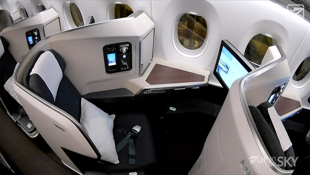 Bij binnenkomst lagen een kussen en linnendeken klaar. De business class beschikt over een noise cancelling koptelefoon, die in een speciaal kastje klaarligt. Het kastje is ook makkelijk om kleine dingen, zoals een telefoon, in op te bergen. Het deurtje is uitgerust met een make-up spiegel. Na binnenkomst worden aminity-kits uitgedeeld die ontworpen zijn door Seventy Eight Percent.