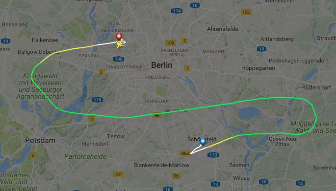 De twee Berlijnse vliegvelden liggen hemelsbreed 25 kilometer van elkaar verwijderd. De vlucht deed er van opstijgen tot landen een half uur over en maakte een mooi S-je boven de stad. De vlucht Tegel-Rhodos was vervolgens vertraagd en kwam er om 12:04 uur aan. Passagiers die op Schönefeld opstapten zou volgens planning er om 07:05 uur op plek van bestemmingen moeten zijn. Vijf uur vertraging dus voor een ‘omleiding’ van 25 kilometer.