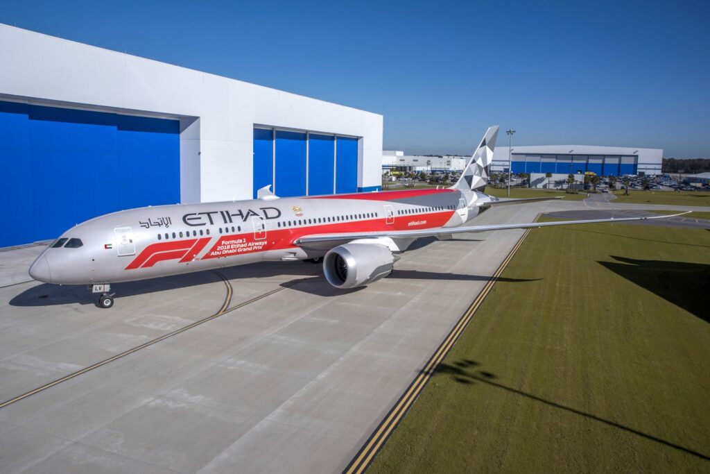 Etihad toont het nieuwe Formule 1-jasje die op een Boeing 787-9 Dreamliner van de maatschappij geschilderd is, zo meldt de luchtvaartmaatschappij uit Abu Dhabi.