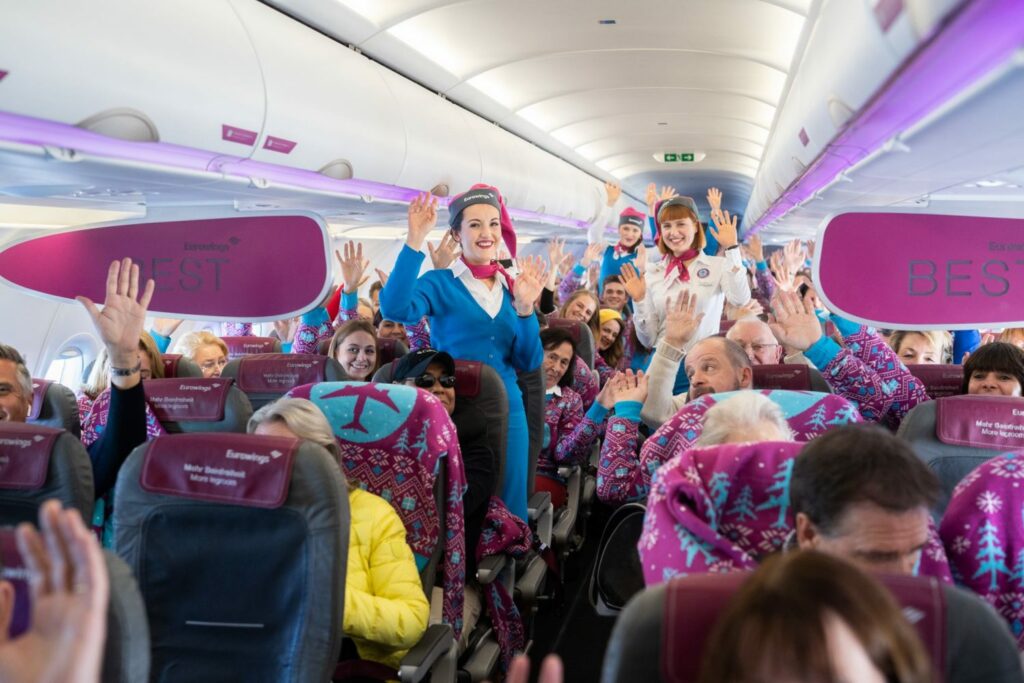 Wel en of geen fan van kerst, passagiers die donderdag met Eurowings van Düsseldorf naar Palma de Mallorca vlogen, werden overladen met lelijke kersttruien, muziek, chocola en glühwein.