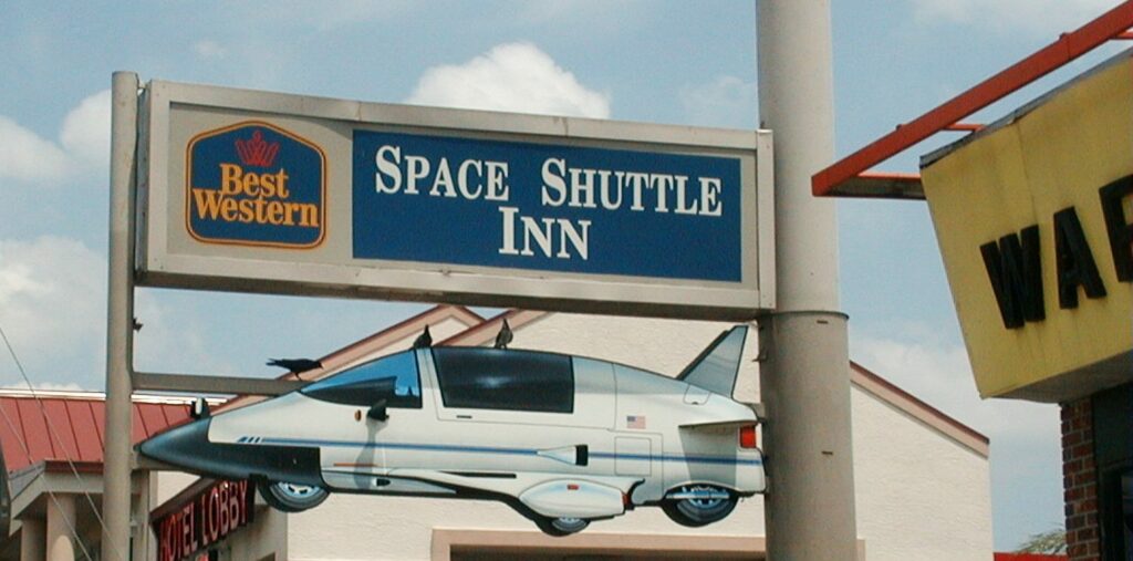 Het maffe uithangbord fotografeerde ik ooit in Titusville. Jammer genoeg is het intussen verdwenen, zoals veel van die lekkere-nostalgische Space Coast Americana.