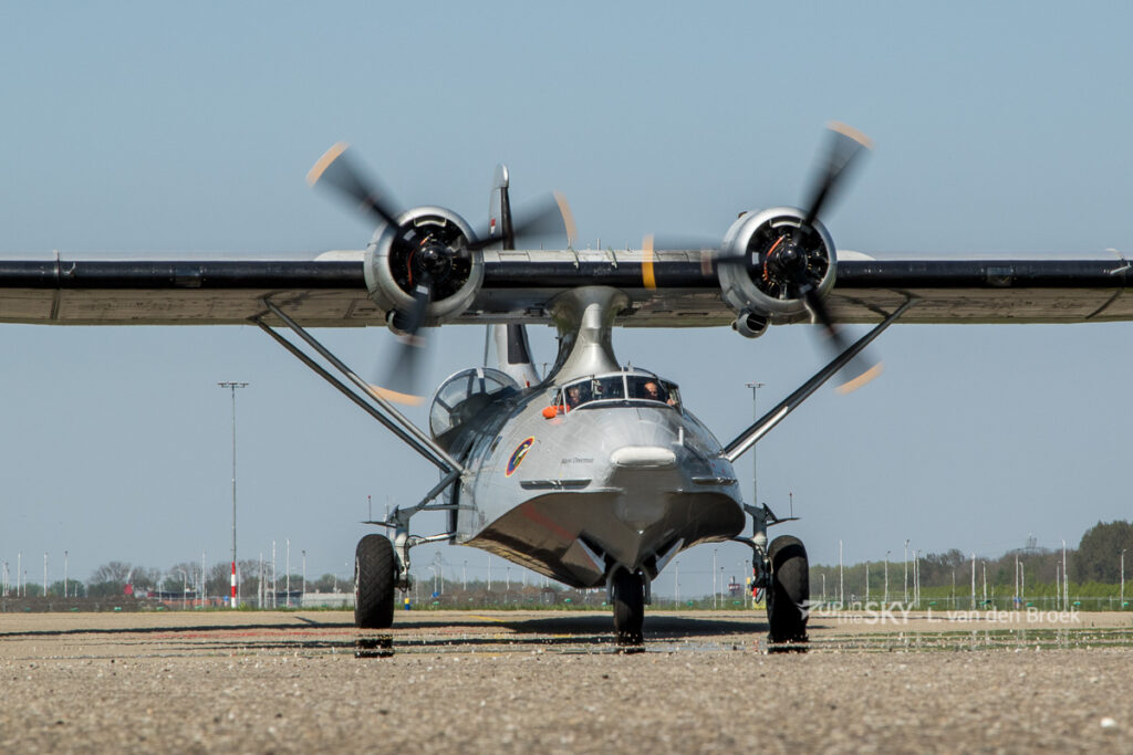De Nederlandse Catalina PH-PBY is op woensdagochtend voorgoed vertrokken naar de Verenigde Staten. Het amfibievliegtuig werd geëscorteerd door Fokker S.11’s van Fokker Four.