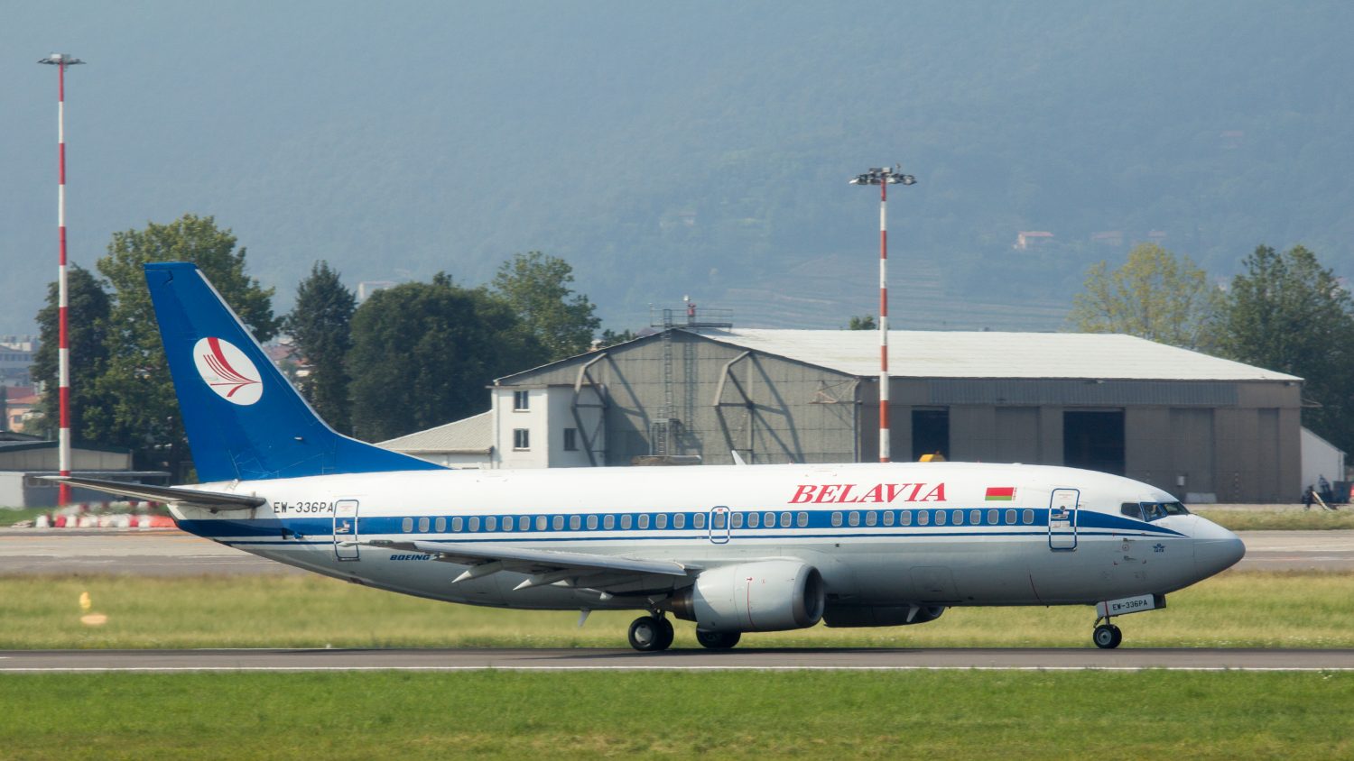 Een Boeing 737-300 van Belavia is vrijdag tijdens de landing in het gras beland. Er is niemand gewond geraakt.