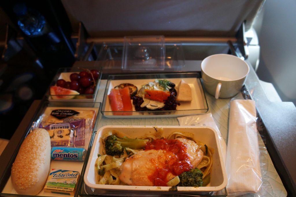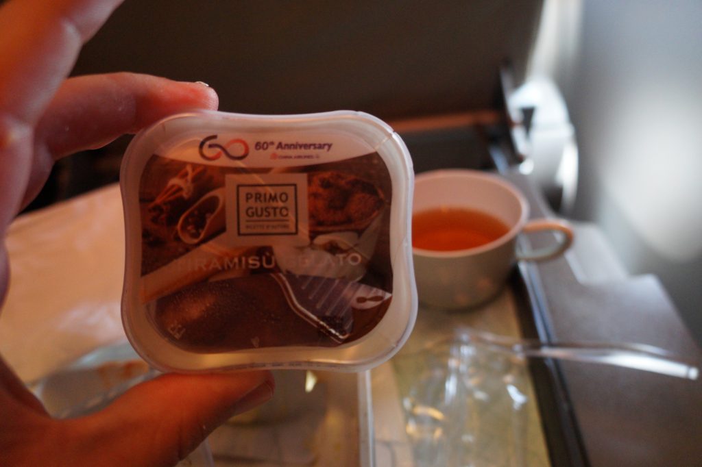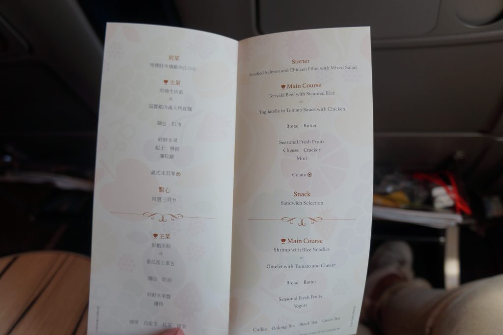 Op de service van China Airlines is weinig aan te merken. Naast twee uitgebreide maaltijden werden continu drankjes en snacks uitgedeeld. Het enige werkelijk vreemde was de tijd waarop het ontbijt werd geserveerd. Ongeveer vijf uur voor de landing werd de kunstmatige nacht onderbroken door met de moodlights de ochtend in te zetten. Vervolgens werd het ontbijt geserveerd waarna de nacht opnieuw werd ingezet. Voor de landing werden nog snackboxes uitgedeeld.