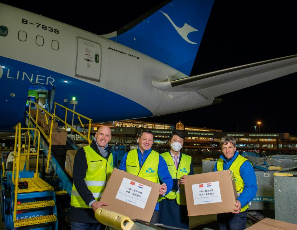 “Gezien de tekorten in de Nederlandse ziekenhuizen helpt KLM op haar beurt het Erasmus MC te Rotterdam en andere Nederlandse zorginstellingen hier weer mee”, zegt KLM. Vanochtend kwam een toestel van Xiamen Airlines met de eerste zending aan van ongeveer 80.000 mondkapjes en 50.000 handschoenen. CEO Pieter Elbers nam de donatie in ontvangst, samen met Ernst Kuipers, bestuursvoorzitter van Erasmus MC en voorzitter van het bestuur van het Landelijk Netwerk Acute Zorg (LNAZ) en Brinio Veldhuijzen van Zanten van KLM Health Services.