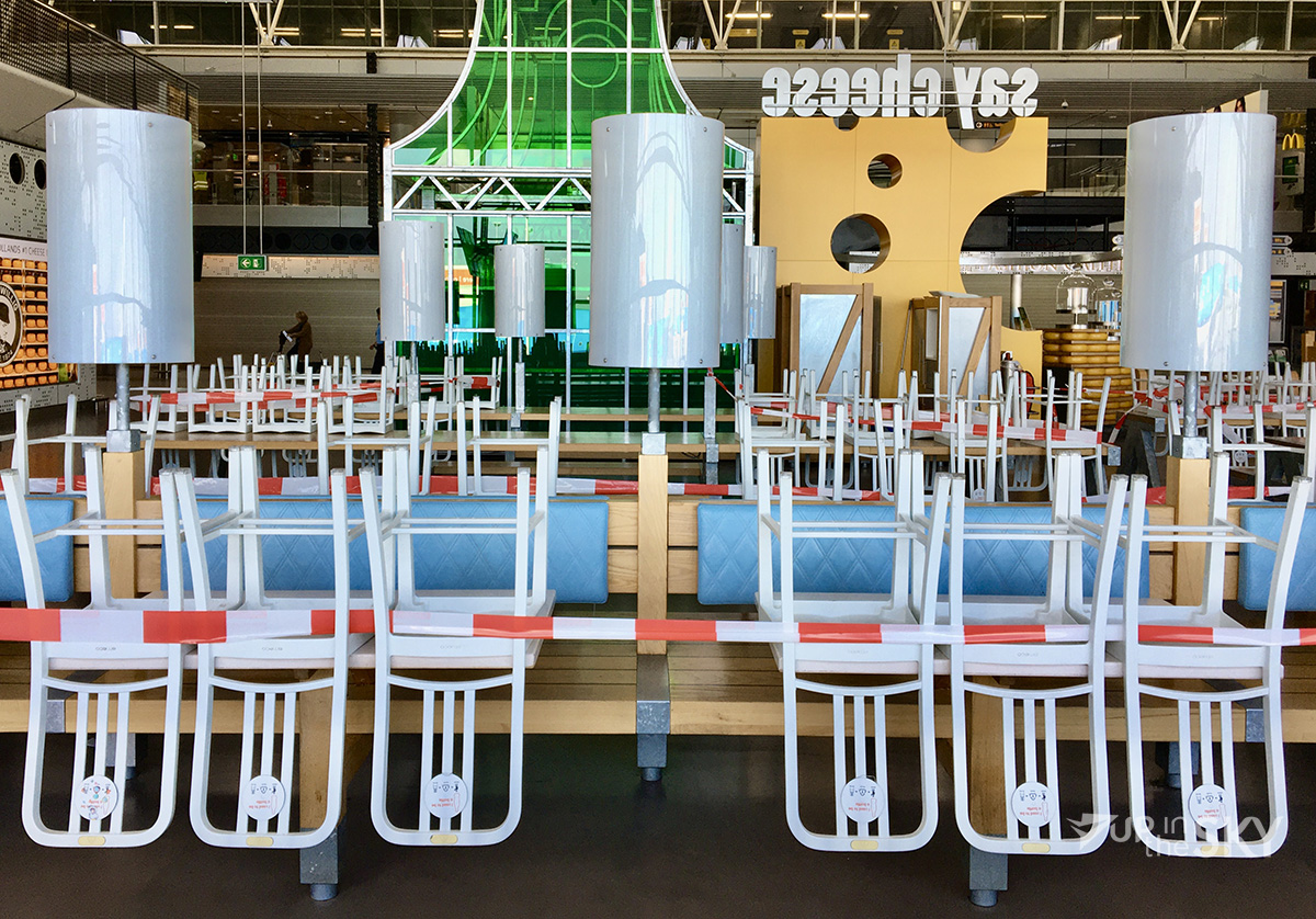 Vandaag sloot Schiphol vertrekhallen, lounges en pieren. Alleen een zeer afgeslankte luchthaven blijft operationeel. Up ging vandaag airside en trof er meer stilstaande vliegtuigen dan passagiers aan.
