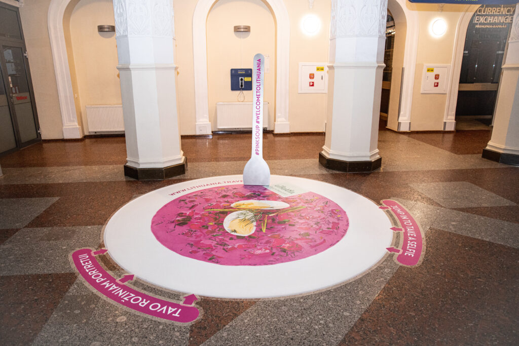 Vilnius Airport komt opnieuw met een bijzondere verwelkoming. Vorig jaar december werd er nog een kerstboom gemaakt van verboden items, tijdens corona werd er een drive-in bioscoop opgezet en nu is er een spoor van roze vlekken op de vloer aangelegd, dat uiteindelijk leidt tot een replica van 3 meter van het nationale gerecht šaltibarščiai.