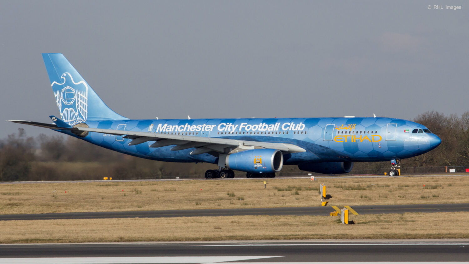 De hoofdsponsor van voetbalclub Manchester City is Etihad. De luchtvaartmaatschappij heeft haar A330 in een blauw jasje gestoken.