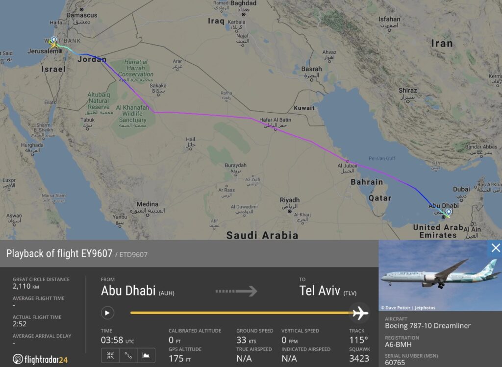 Vlucht EY9607 steeg om 04:55 lokale tijd op in Abu Dhabi om een kleine drie uur later te landen in Tel Aviv. Etihad gebruikt voor de vlucht een Boeing 787-10 Dreamliner met de registratie A6-BMH die vanwege de groene livery ook wel ‘Greenliner’ wordt genoemd. Eerder dit jaar voerde Etihad ook twee vluchten uit naar Israël, maar dit waren vrachtvluchten ter ondersteuning aan de maatregelen tegen de corona pandemie.