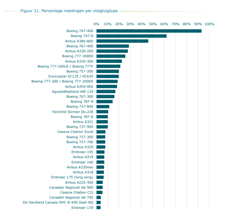 Het percentage van meldingen per vliegtuigtype biedt ook een interessant perspectief. De viermotorige 747’s en A380’s blijken niet erg populair, al lijkt de 747-400 de grootste hoeveelheid klachten op te leveren. Uit de BAS-statistieken blijkt bovendien dat, net als in voorgaande jaren, de meeste meldingen worden ingediend over startende 747 Cargo-vluchten in de late avond en nacht.