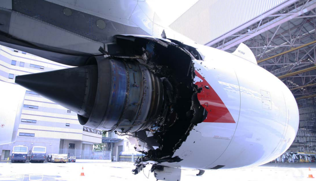 Het officiële onderzoeksrapport van de Australian Transport Safety Board (ATSB) uit 2013 duidt een uncontained engine rotor failure in motor 2 aan als de directe aanleiding van deze bijna-ramp. De technische oorzaak lag in een onderdeel van het olietoevoerkanaal dat niet voldeed aan de ontwerpspecificaties van deze Rolls-Royce Trent 900-motor. Door metaalmoeheid barstte dit onderdeel, waardoor olie in de hete delen van de motor werd gespoten. De turbine werd door de felle brand die hierop volgde ernstig verzwakt, en brak gedeeltelijk af. Hierbij kwam zoveel energie vrij dat de motorbehuizing werd weggevaagd, en brokstukken met hoge snelheid de overige drie motoren, beide vleugels, de romp en de staart raakten. Zowel het airframe als de boordsystemen raakten dusdanig zwaar beschadigd dat de bemanning geen betrouwbare informatie meer kreeg over de status en bestuurbaarheid van hun vliegtuig. Toch slaagden zij erin om controle over het toestel te houden en terug te keren naar Singapore, waar alle passagiers en bemanningsleden uiteindelijk veilig konden uitstappen. Onderdelen van de beschadigde A380 werden later teruggevonden op het Indonesische eiland Batam, waar zij weliswaar schade veroorzaakten aan enkele gebouwen, maar waarbij gelukkig ook geen slachtoffers vielen.