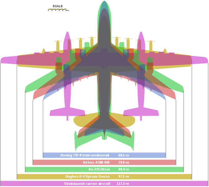 En dan het grootste vliegtuig ter wereld. De Stratolaunch met een lengte van 73 meter en een spanwijdte van 117 meter. De Stratolaunch maakte haar eerste vlucht in 2019 en verbrak het record van de Spruce Goose voor breedste vliegtuig ter wereld. Het vliegtuig is onder leiding van miljardair Paul Allen geproduceerd. Naast dat het het grootste vliegtuig is, is het ontwerp van dit vliegtuig een van de meest onhandige, omdat het werd gebouwd door de twee rompen samen te voegen om te voldoen aan de behoefte van de particuliere ruimtevaartindustrie. Dit vliegtuig zal worden gebruikt als vliegend lanceerplatform voor de Talon A.