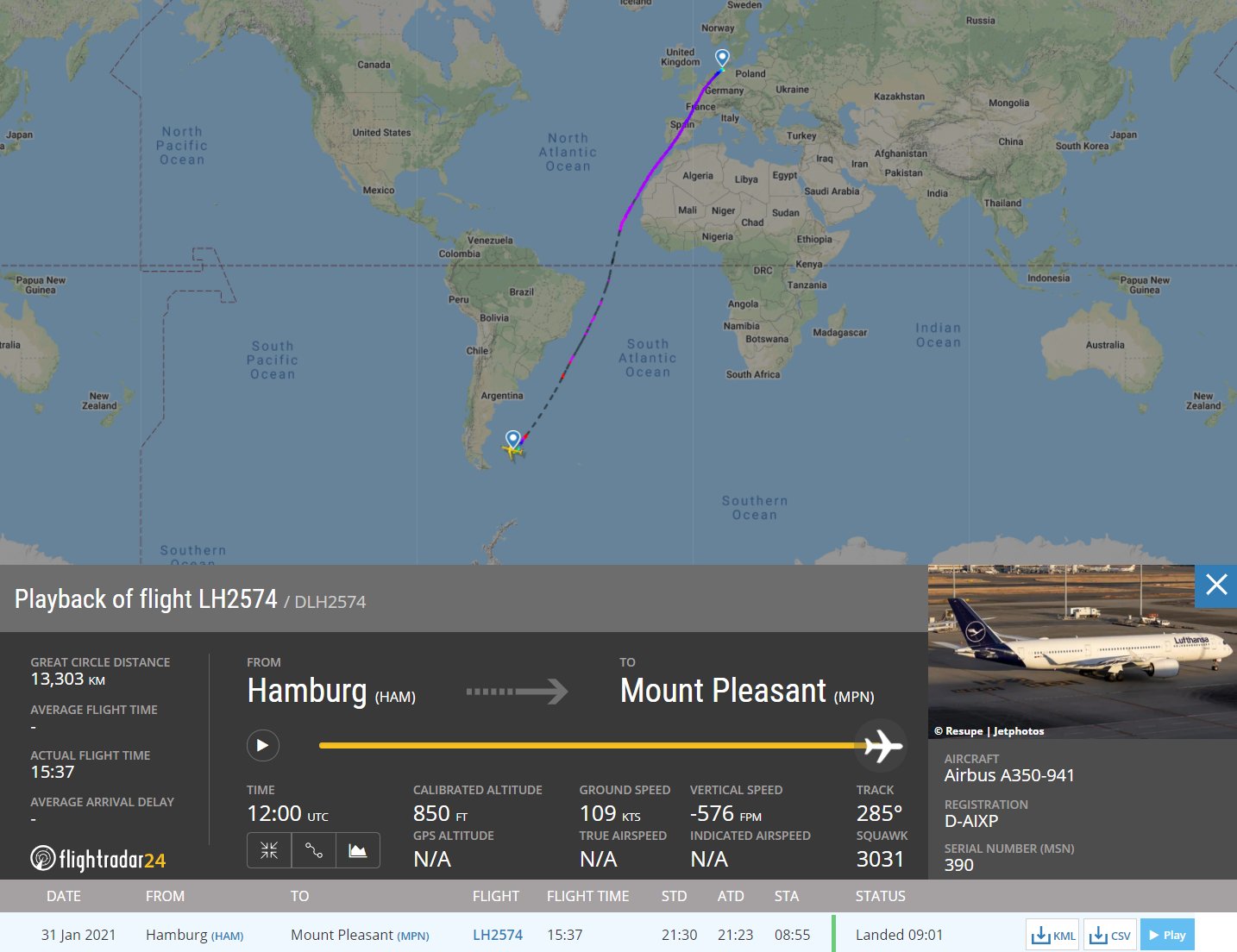 Zojuist is de langste passagiersvlucht die Lufthansa ooit heeft uitgevoerd geland op de Falklandeilanden. De Airbus A350 was ruim vijftien uur in de lucht.