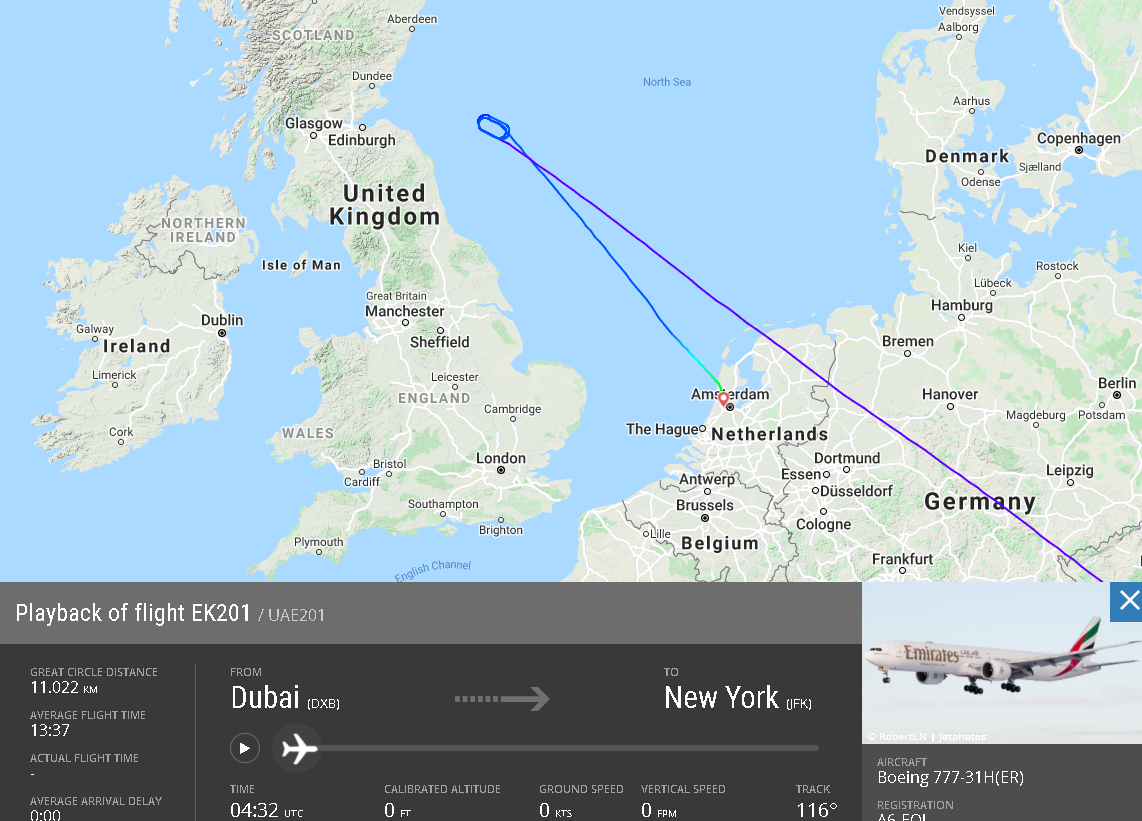 De Boeing 777 was onderweg van Dubai naar New York. Totdat het vliegtuig boven het Verenigd Koninkrijk opeens uit moest wijken naar Amsterdam. Hier is het vliegtuig veilig geland. Uit voorzorg is de brandweer uitgerukt.