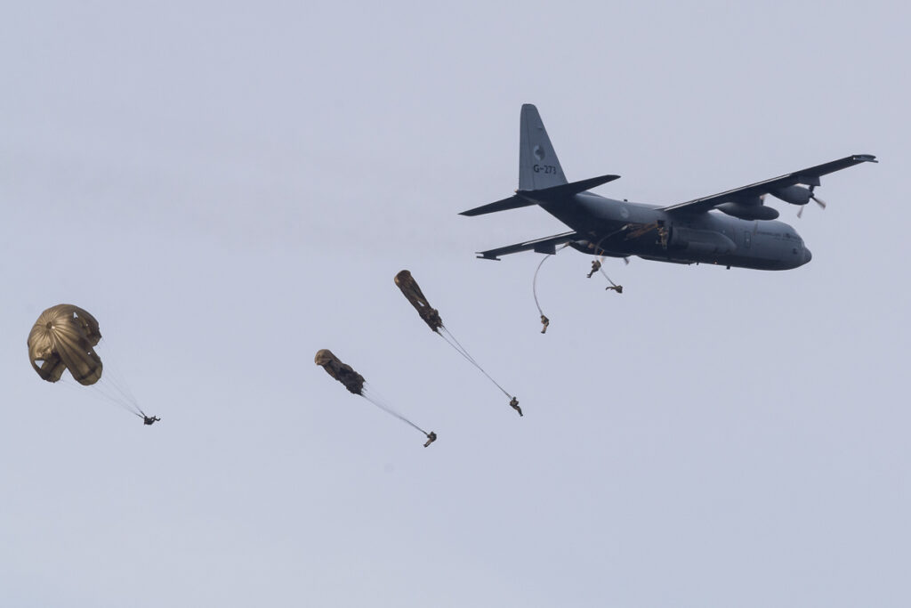 Een Hercules dropt op 12 april parachutisten in de omgeving van Rotterdam tijdens de anti-terreuroefening ‘Port Defender’. Deze oefening duurt tot 14 april. Er wordt samengewerkt met de Koninklijke Marine, de Dienst Speciale Interventies en het Defensie Helikopter Commando.