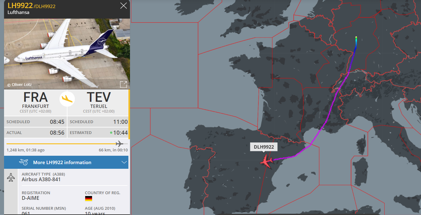 De D-AIME is de vierde A380 dit jaar die naar Teruel vliegt. Tussen januari en mei worden er door Lufthansa in totaal vijf A380’s naar de Spaanse opslagfaciliteit overgebracht; iedere maand eentje. In dat kader werd vorige maand de D-AIMD al naar Spanje gevlogen. Dat toestel had toen al meer dan een jaar geen passagiers meer vervoerd, en had in de periode maart 2020 tot maart 2021 slechts 38 minuten gevlogen.