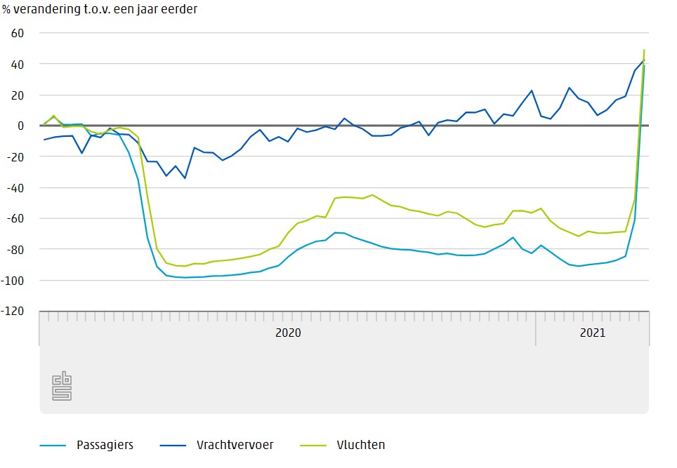 In het begin van de pandemie is de luchtvaart stilgelegd. Er is aangeraden om alleen noodzakelijke reizen te maken. Meteen na deze afkondiging daalde in week 12 het aantal luchtvaartpassagiers van en naar Nederland met ruim 57 procent tot 385,1 duizend. De weken daarna daalde het aantal passagiers verder, met als laagterecord 24,6 duizend passagiers in week 16, half april. Een jaar eerder waren dit 1,6 miljoen passagiers.