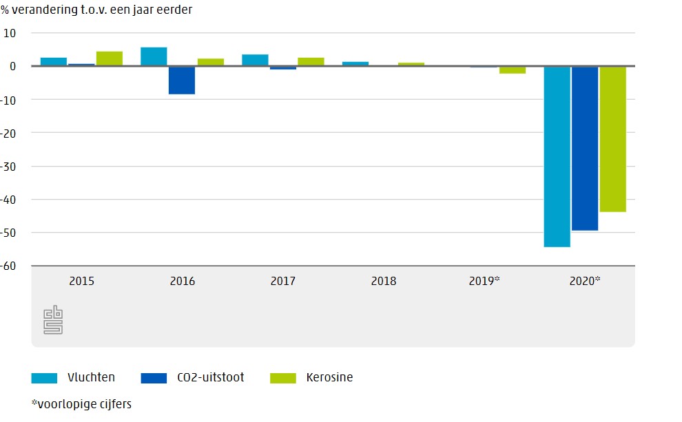 De CO2-uitstoot van de luchtvaart was in 2020 49 procent lager dan in 2019. In 2019 werd er in Nederland nog 3,9 miljard kilogram kerosine getankt, een jaar later was dat 2,2 miljard kilogram, een afname van bijna 44 procent.