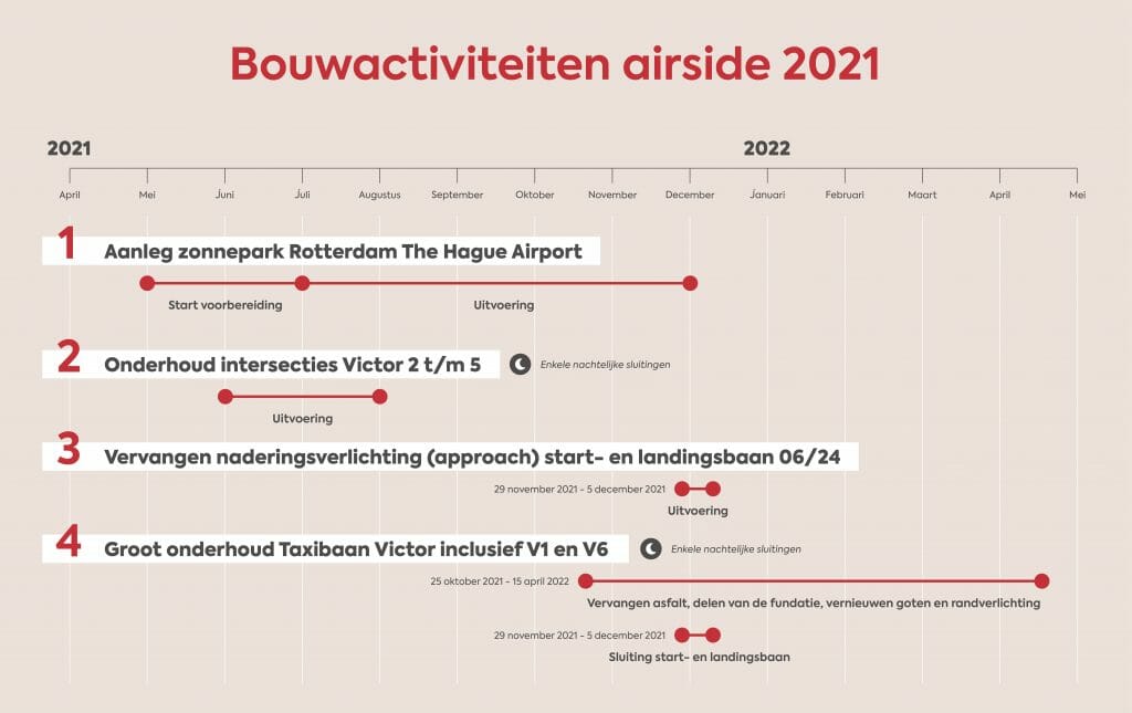 De onderstaande afbeelding weergeeft de verbouwingsschema van Rotterdam Airport voor 2021: