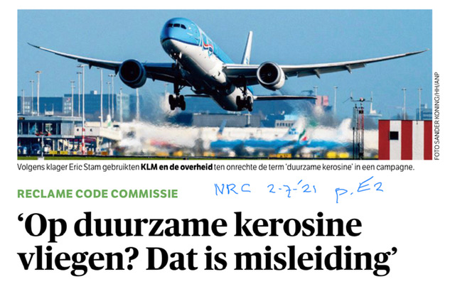 Volgens een artikel in de NRC van 2 juli 2021 heeft de Reclame Code Commissie (RCC) een klacht tegen de KLM over duurzame kerosine ontvangen. Vier uitspraken in dat artikel vallen nogal op. De eerste is dat de klacht niet over reclame gaat, maar over een persbericht. En ik wist niet dat de RCC zich daar ook mee bezig houdt.