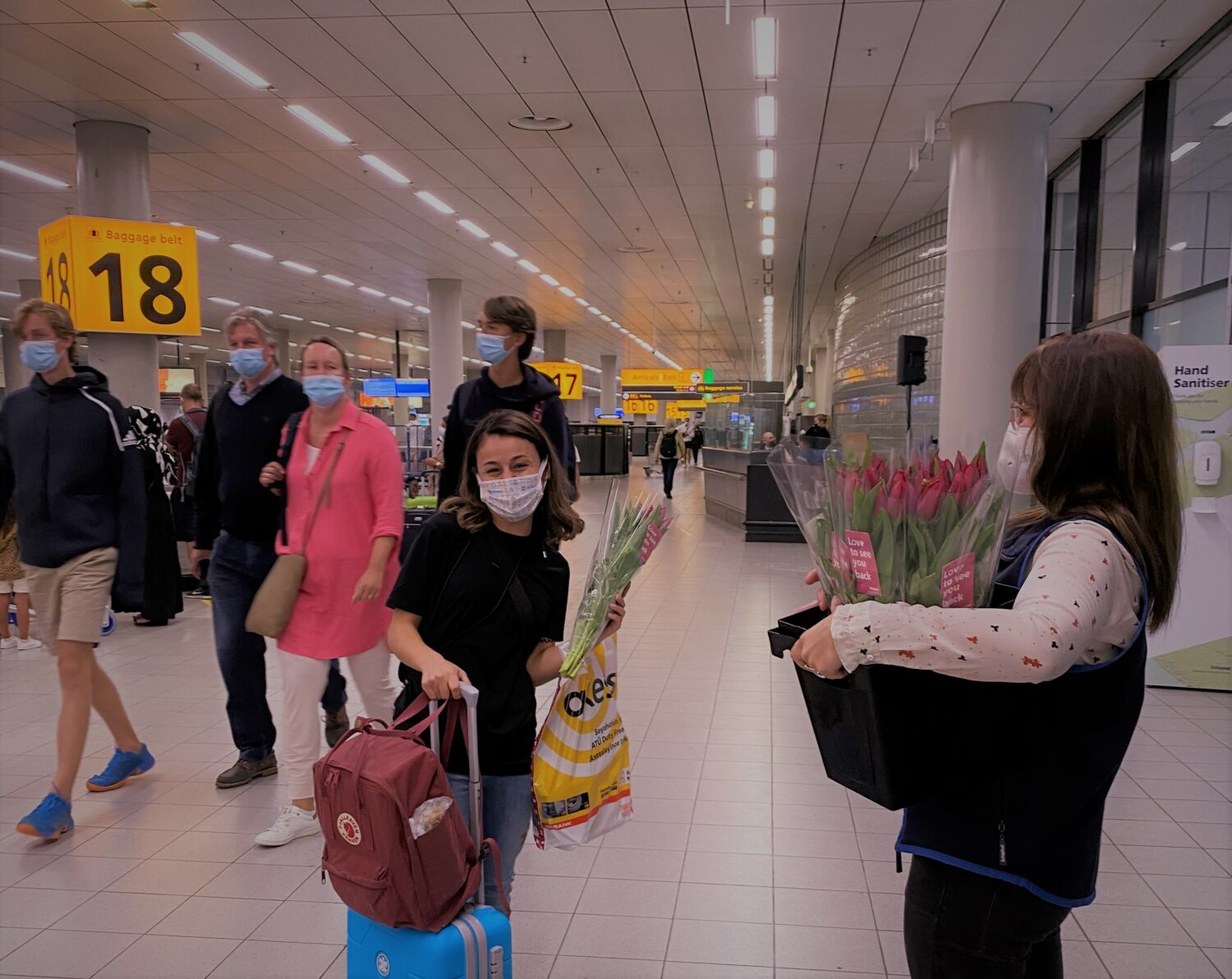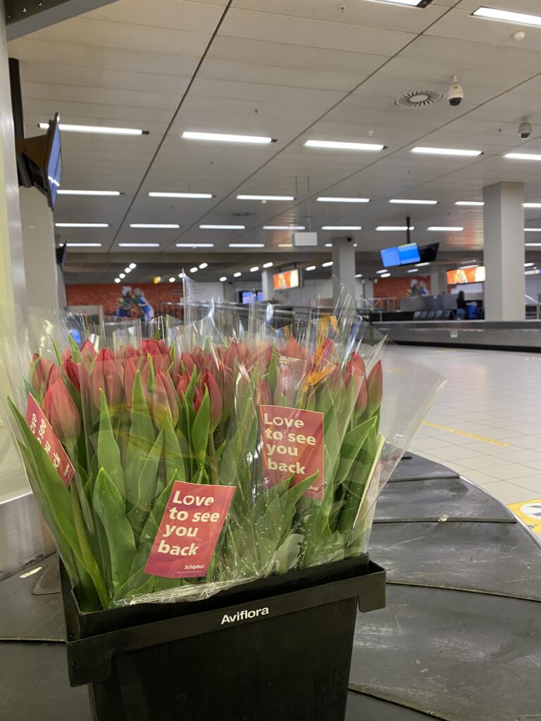 Met tulpen werden de reizigers in de aankomsthal ontvangen. Bij de bos zaten kaartjes met de tekst ‘Love to see you back’. De kaartjes zijn gemaakt van tulpenbollen en de bloemen zijn afkomstig van Royal Flora Holland.