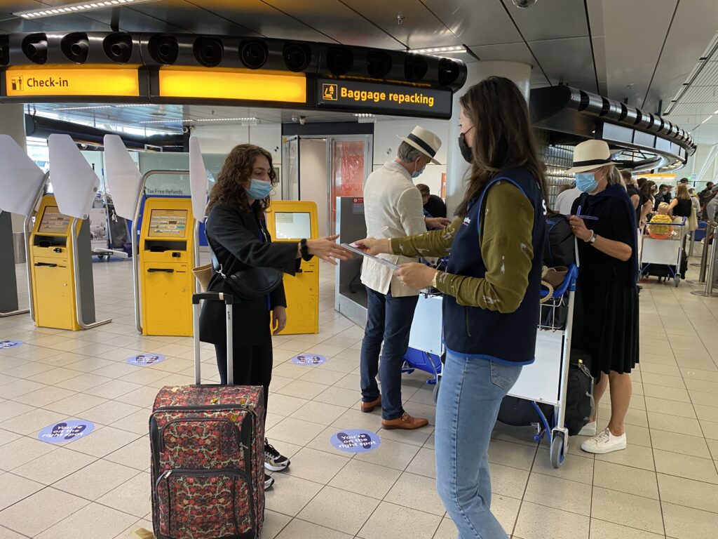 Ook vertrekkende reizigers werden verrast. Bij de vertrekhallen werden Schiphol-bagagelabels in allerlei verschillende kleuren uitgedeeld.