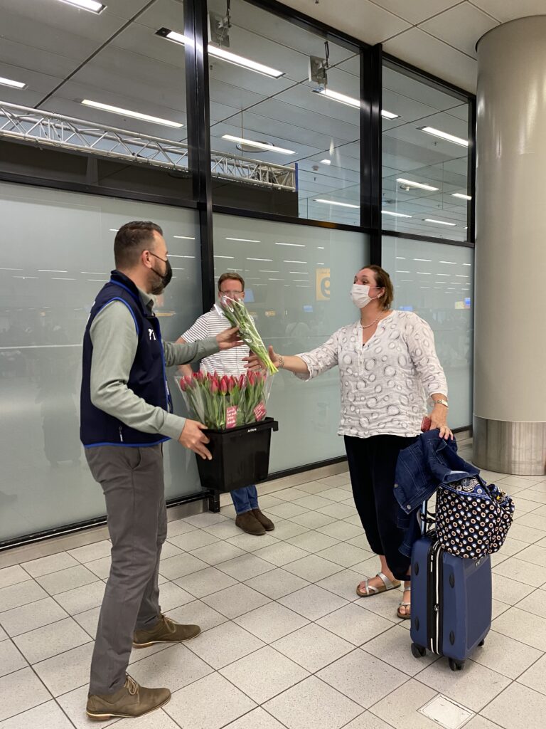 “Deze zomer hebben we op verschillende dagen bij de bagagebanden Hollandse tulpen uitgedeeld aan onze terugkerende reizigers. We zijn blij om ze weer op Schiphol te mogen verwelkomen en met dit typisch Hollandse cadeautje willen we dat ook laten blijken.”